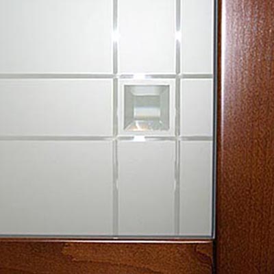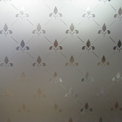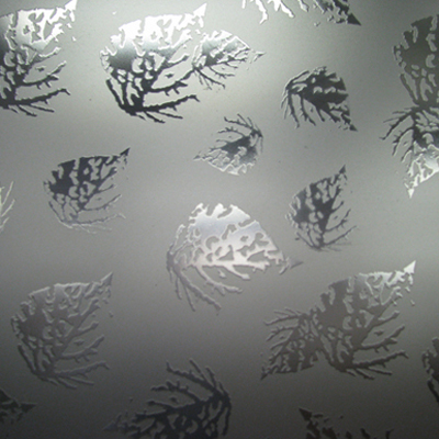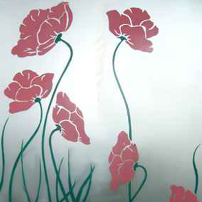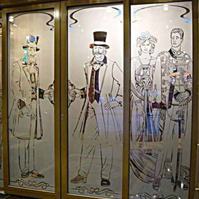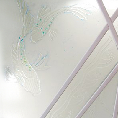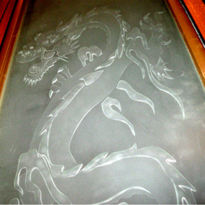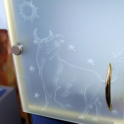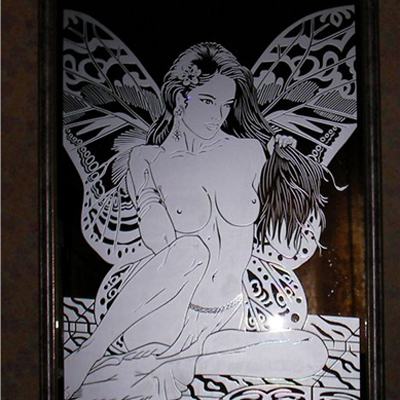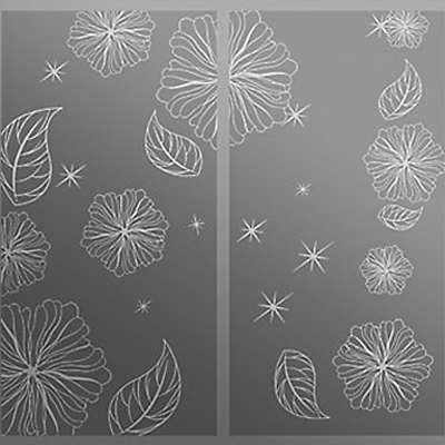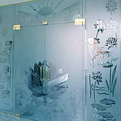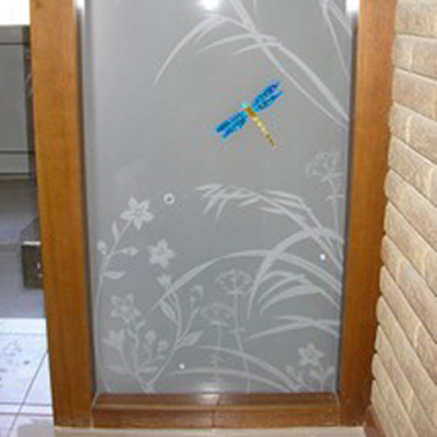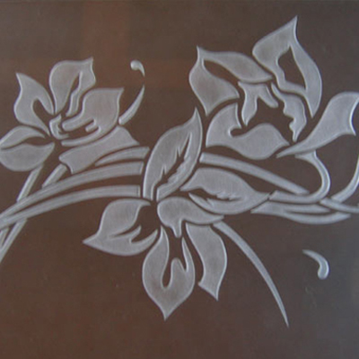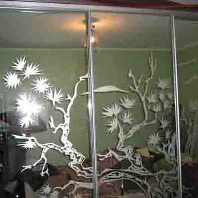 Витраж, выполненный в технике пескоструйной гравировки, – наиболее известный способ декорирования стекла и зеркала. Графика наносится по трафарету частицами абразива в струе сжатого воздуха. Рисунок, создаваемый при помощи этой технологии, может быть как плоским, так и объемным. Плоский рисунок получается в результате кратковременной обработки: в этом случае поверхность стекла, не защищенная трафаретом, просто меняется с глянцевой на матовую. При длительной обработке рисунок «утопает» в стекле и превращается в объемную (3D) графику. Используя несколько трафаретов, можно получить причудливую композицию с разной глубиной орнамента.