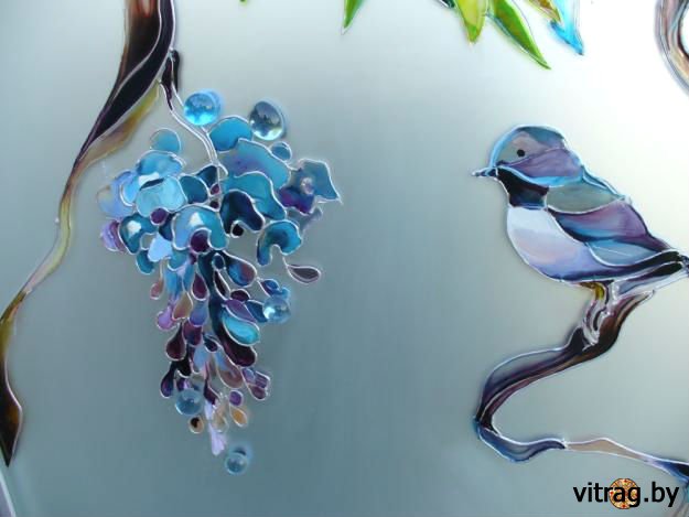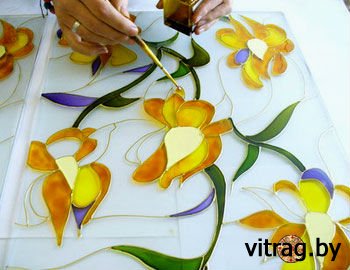 роспись стекла красками. У этого способа имеется два решения: в первом случае прозрачное стекло расписывают красками и затем обжигают в специальной печи, а втором подразумевается роспись красками, которые не требуют термической обработки.