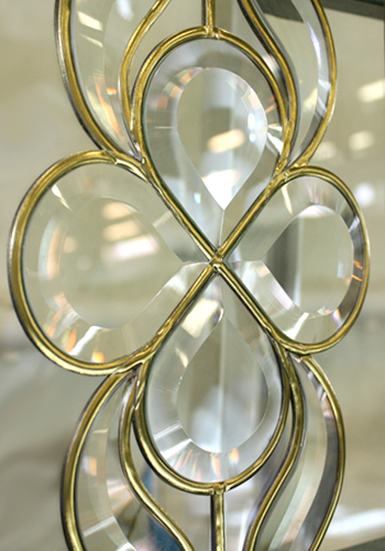 фацетированные детали собираются в медную или латунную более прочную оправу. Витраж подобного рода лучше разместить в дверцах мебели, межкомнатных дверях. Такая оправа способна выдержать нагрузку при закрывании и открывании (свинец в данном случае будет провисать). Оттенок золотистого цвета латунной или медной оправы придает изделиям дорогой вид, что немаловажно.