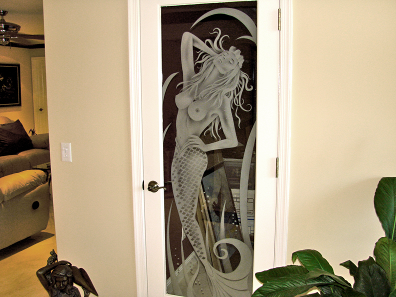 Сделан пескоструструйный витраж может быть и на стекле бесцветном, даже на зеркале. Сама по себе техника позволяет создавать достаточно сложные по своей графике рисунки, которые уже на последних этапах производства могут дополняться интересными деталями.