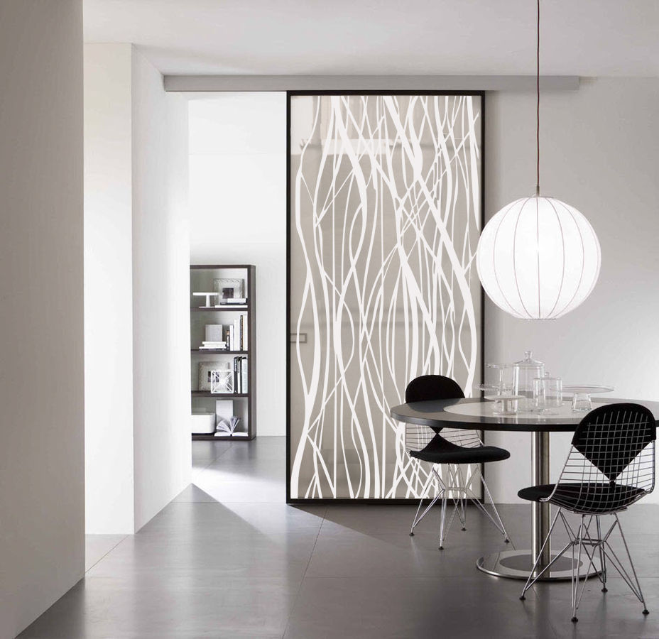 Частенько увидеть подобные стеклянные двери с каким-либо рисунком можно в офисах, там же часто встречаются и матовые стеклянные перегородки с геометрическими рисунками. Пескоструем оформляется в основном логотип компании или таблички на дверях. Дома также выбрана может быть любая тема рисунка. Обычно увидеть можно подобный рисунок дома в качестве вставки в деревянные двери.