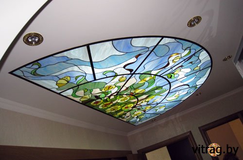Надо отметить, что витражный потолок не только украсит комнату, но и скроет погрешности на потолке или коммуникации, которые располагают за подвесными потолками. Витраж при этом при необходимости легко можно снять и пробраться к коммуникациям для их последующего ремонта.