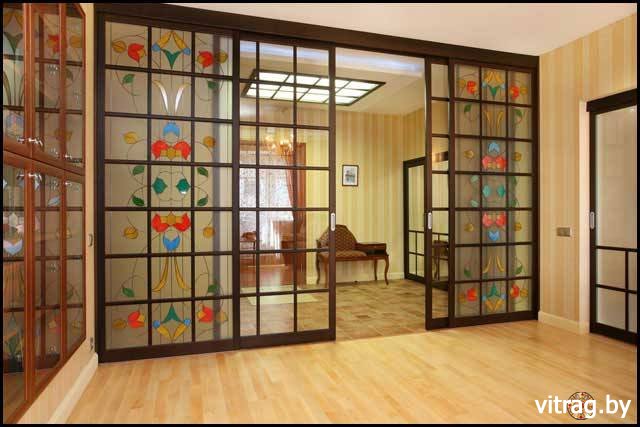 Очень часто можно услышать о том, что витражи применяются на окнах. О применении витражей в межкомнатных перегородках известно не так много, однако в последнее время все чаще витражи применяются и тут. В чем же дело? Раньше сделать витраж было очень сложно. Это была кропотливая работа для мастеров, которые помогали витражами создать в храме ту неповторимую атмосферу, которая внушала божественный трепет. Сегодня витраж сделать проще, да и воспринимается он по другому. Секрет красоты витража именно в освещении или в игре света на цветных гранях. Легкая витражная перегородка может создать эффект воздушности. Особенно важно это в том случае, когда нужно не отгораживать пространство, а просто разделять его. Помещение с такой перегородкой как бы перетекает из одной комнаты к другой. Такие перегородки гармонично и красиво смотрятся в большом и просторном помещении.